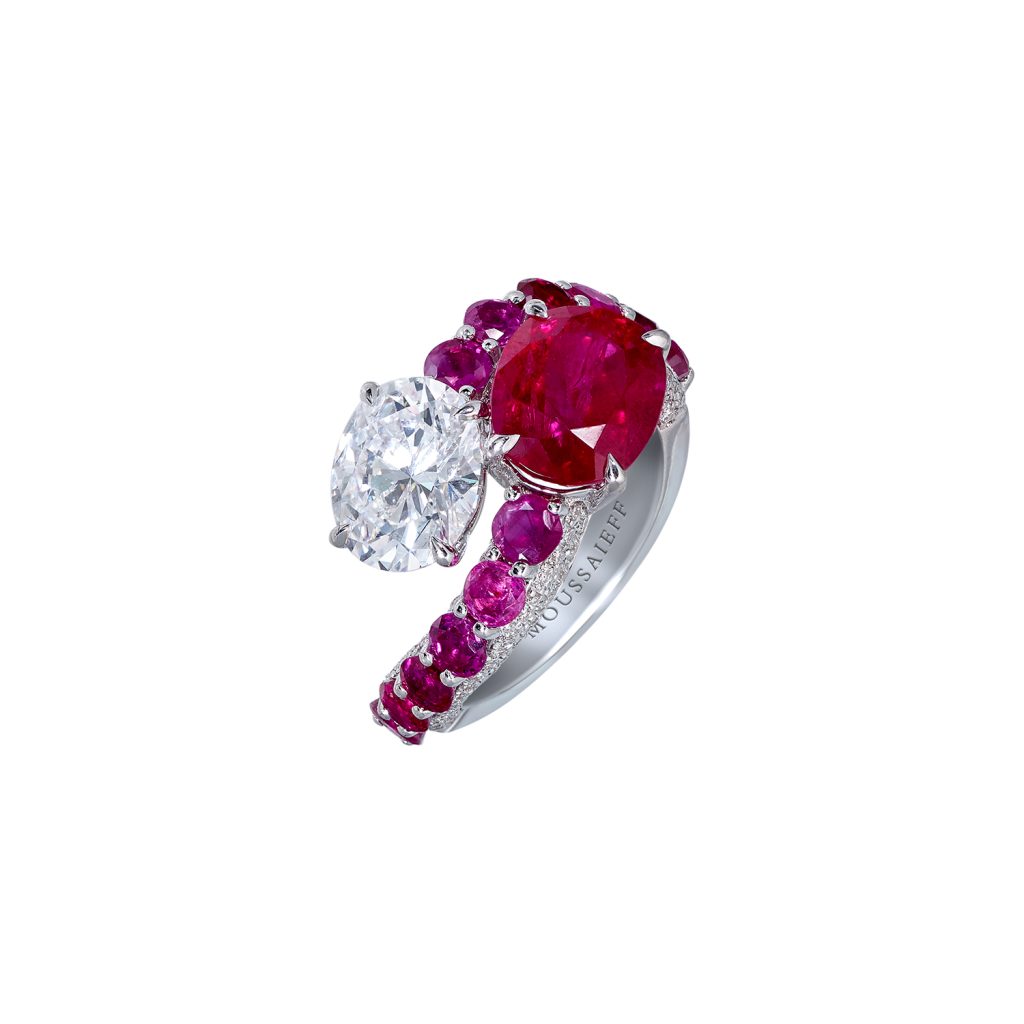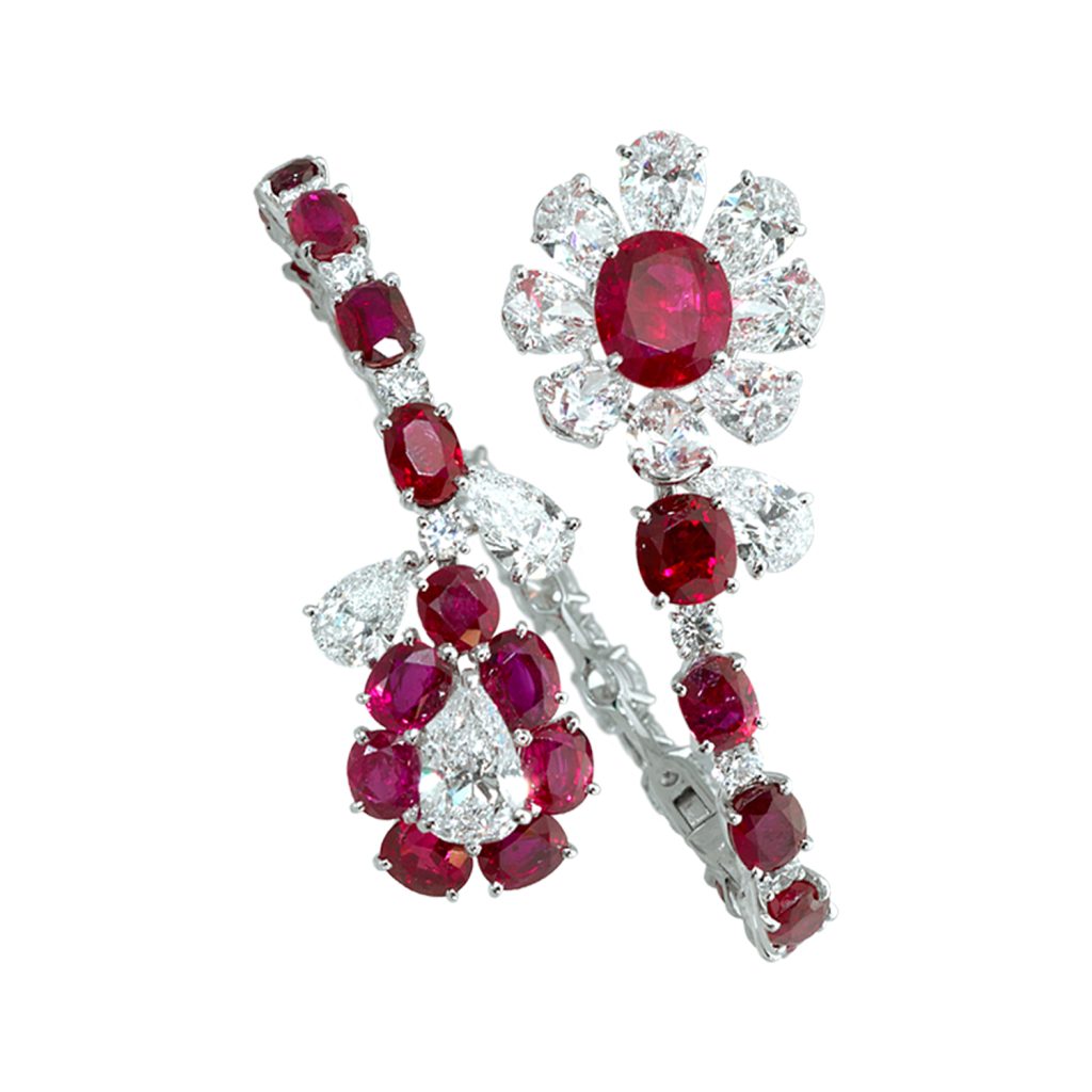 A bangle with 27.28 carats of rubies and 18.04 carats of diamonds, and a matching ring with 7.42 carats of rubies and 3.13 carats of diamonds, both set in white gold.